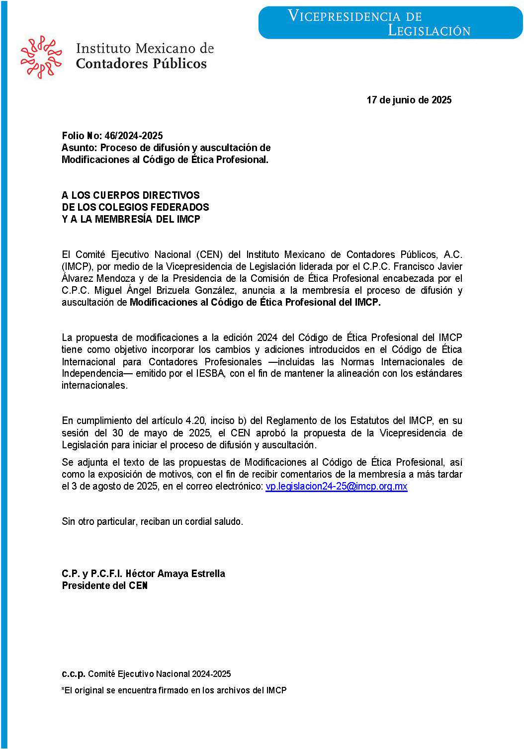 Folio 32/2025-2026.- Conclusión del primer periodo de votación e inicio del segundo periodo de votación del Proyecto de Reformas a los Estatutos del IMCP